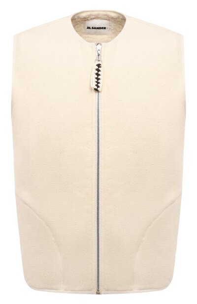 Слегка укороченный кремовый жилет с круглым вырезом можно носить наружу любой из двух сторон: гладкой или фактурной, напоминающей стриженую овчину. Для пошива модели мастера марки, основанной Джил Сандер, использовали плотный хлопковый флис, который хорошо удерживает тепло и немного тянется, обеспечивая комфортную посадку. Изделие с накладными карманами застегивается молнией с крупным пуллером, связанным крючком вручную.