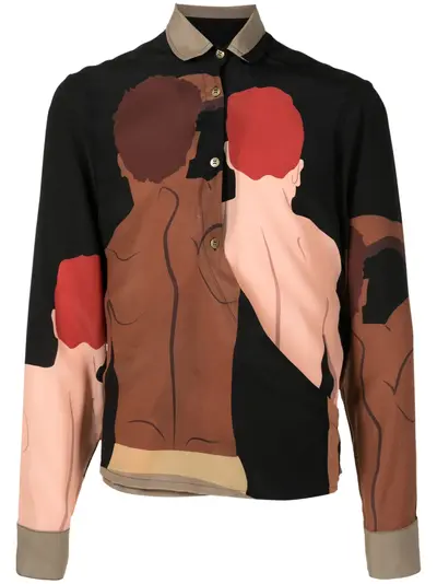 brown/multicolour silk all-over graphic print polo collar front button placket long sleeves buttoned cuffs rear tie fastening