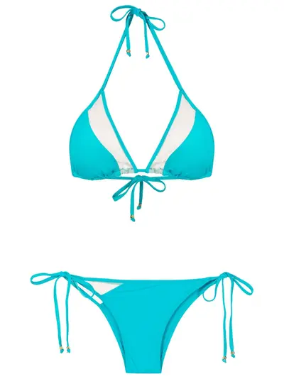 aqua blue stretch-design sheer panels triangle cup halterneck tie fastening rear tie fastening side-tie bottoms Be mindful to try on swimwear over your own garments.
