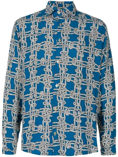 blue satin finish all-over graphic print classic collar long sleeves front button fastening straight hem