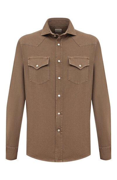 Рубашку сшили из облегченного мягкого денима, для которого отобрали хлопок с длинными и тонкими волокнами. Текстиль хорошо пропускает воздух и позволяет носить модель не только поверх футболки, но и на голое тело. Окрашивание в готовом виде сделало бежевый оттенок приглушенным и сформировало светлые полосы на швах. Манжеты застегиваются пуговицами, а фигурные клапаны нагрудных карманов – кнопками, как и само изделие.