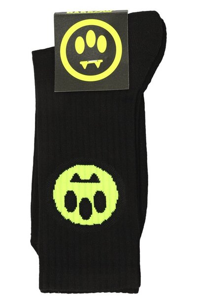 Черные носки украсили белым жаккардовым логотипом на подошве и кислотно-желтой эмблемой на высоком паголенке. Для изготовления модели с рифленым мотивом использовали мягкий эластичный хлопок с добавлением шелковистого прочного нейлона. Изделие из такого материала комфортно облегает ногу, не препятствует циркуляции воздуха и быстро отводит лишнюю влагу.