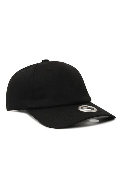 Черная бейсболка с эластичным узким ремешком, регулирующим посадку, сшита из прочного хлопкового габардина. Материал хорошо пропускает воздух, а изделия из него не мнутся и хорошо держат заданную форму. Изогнутый жесткий козырек украшен крупным люверсом с выгравированным логотипом бренда.