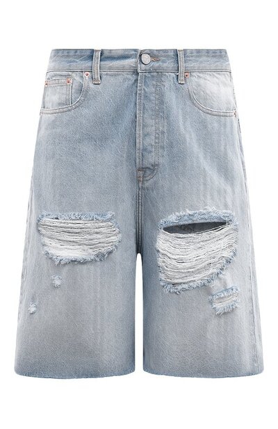 Голубые расклешенные шорты сделают повседневный комплект максимально непринужденным. Необработанные края низа, выбеленность и крупные потертости создают иллюзию, что модель переделали из джинсов, прослуживших не один сезон. Изделие из мягкого денима декорировали вышитыми литерами V на задних карманах и фирменным патчем на поясе.