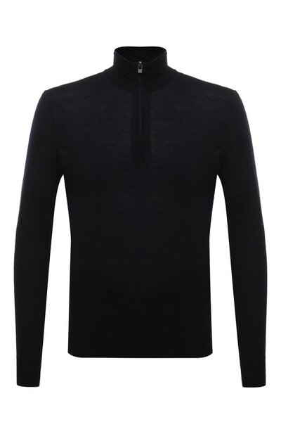 Лаконичный темно-синий джемпер выполнили из особенно мягкого трикотажа, для производства которого использовали шерсть первого пострига. Материал поддерживает комфортный микроклимат, а за счет слегка эластичной структуры полотна изделие не ограничивает свободу движений. Модель с невысоким воротом застегивается короткой молнией.
