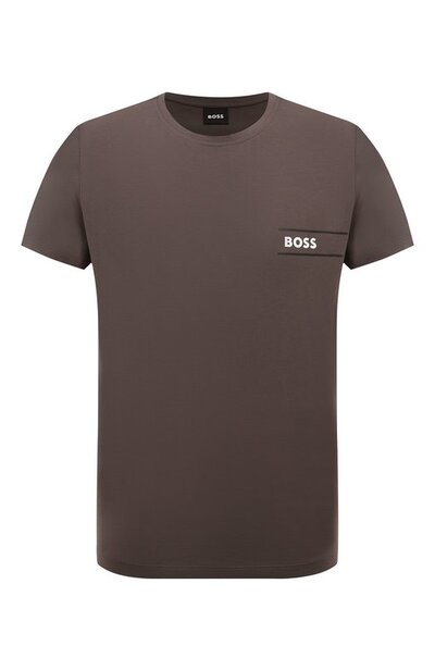 Для пошива коричневой футболки с круглой горловиной выбрали мягкое хлопковое джерси, которое славится способностью пропускать воздух. Эластичное переплетение нитей у материала делает посадку вещи по фигуре особенно удобной. Спереди изделие украсили логотипом, который обрамили короткими полосами.