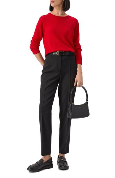Для пошива укороченных черных брюк мастера марки, основанной Хуго Фердинандом Боссом, использовали тонкую шелковистую шерсть первого пострига. Ее закупили на фермах, где строго соблюдают принципы ответственного животноводства и не проводят процедуру мьюлесинга. Мягкий материал с упругими гладкими волокнами не подвержен пилингу и почти не мнется, поэтому стрелки долго не потеряют безупречный вид.