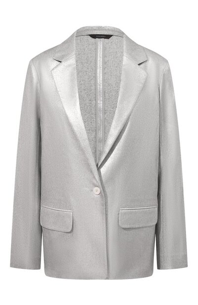 Серебристый жакет сможет сыграть роль первой скрипки в образе. Для пошива изделия с двумя карманами и прямоугольными лацканами мастера марки, основанной Луиджи Коломбо, использовали металлизированный плотный кашемир. Текстиль выполнили из пуха коз кашмирской породы, который ценится за сочетание неповторимой легкости и мягкого тепла.