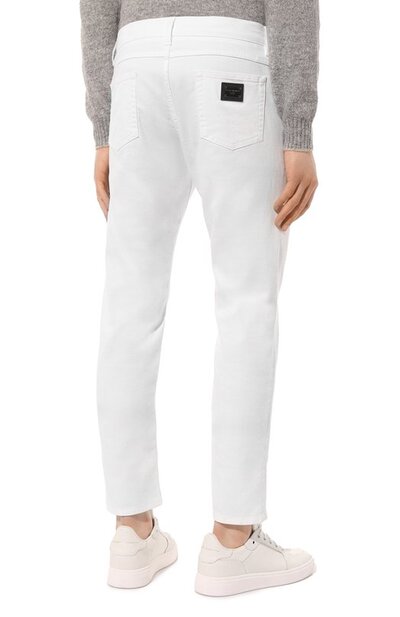 Белые джинсы зауженного кроя станут хорошим компаньоном и для лаконичного свитера, и для яркой футболки. Справиться с многозадачностью модели позволяет минимум декора. Спереди карман дополнили узкой черной нашивкой с логотипом марки, а сзади — фирменной пластиной. Изделие сшили из плотного хлопка с небольшим добавлением эластана.