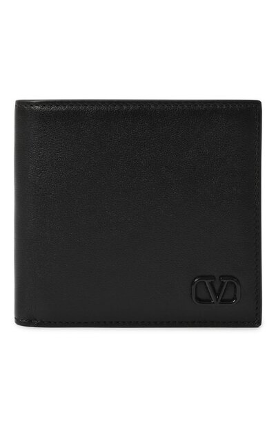 Для пошива черного портмоне двойного сложения использовали мягкую телячью кожу. Переднюю панель украсили объемной лакированной накладкой в виде эмблемы VLogo, которую окрасили в тон модели. Изделие с двумя отделениям для купюр и боковыми карманами для чеков дополнили восемью слотами для банковских карт.