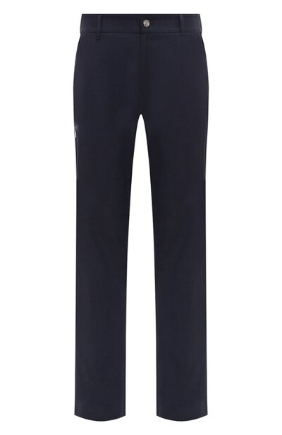 Темно-синие лаконичные брюки сшиты из гладкого хлопка с добавлением прочного шелка. Ткань хорошо пропускает воздух, а исключительный уровень конструирования и соединения деталей гарантирует безупречную посадку по фигуре. Модель с пятью врезными карманами украшена сзади пластиной с логотипом марки.
