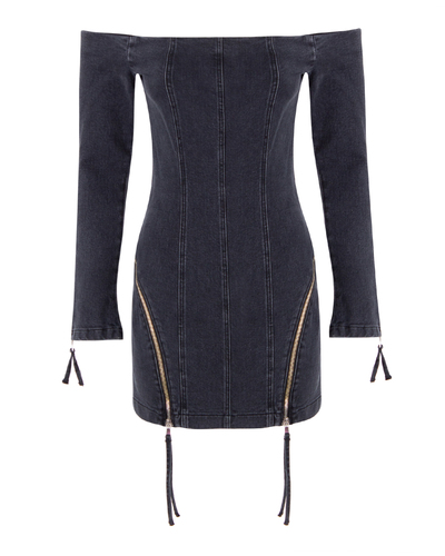 Платье BLUMARINE из эластичного хлопка серого оттенка со стираным эффектом. Модель длины мини облегающего силуэта с открытыми плечами и металлическими молниями сбоку.