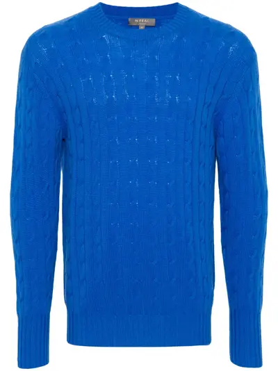 electric blue organic cashmere cable knit crew neck long sleeves straight hem