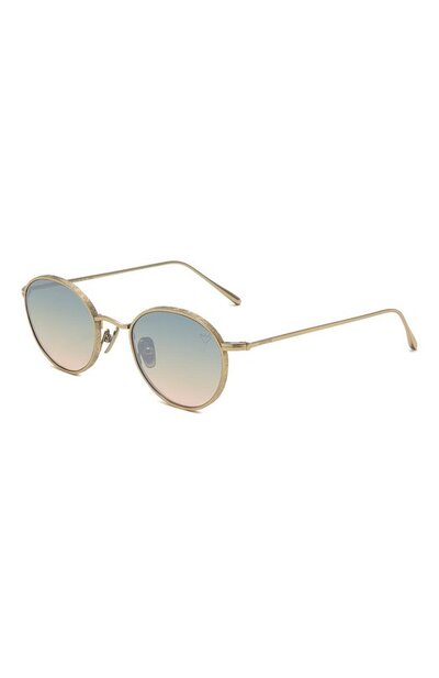 Гравировка на рамках и цвет античного золота придают солнцезащитным очкам сходство с ретромоделями. Изогнутый мост и подвижные носоупоры обеспечивают комфортную посадку, адаптируя аксессуар и для мужского, и для женского лица. Тонкую оправу из легкого прочного титана дополнили разноцветными градиентными линзами, на 100% защищающими глаза от ультрафиолета.