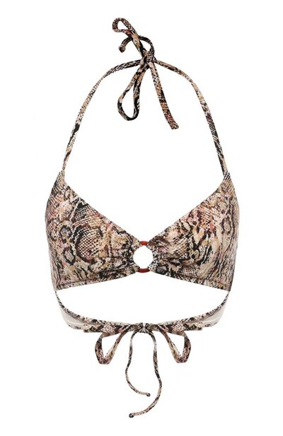 Разноцветное бра с принтом под рептилию выполнили из мягкой быстросохнущей микрофибры. Приятный на ощупь материал идеально тянется, поэтому модель с треугольными чашечками, дополненными декоративным кольцом спереди, комфортно садится по фигуре. Изделие завязывается узкими лентами на шее и спине.