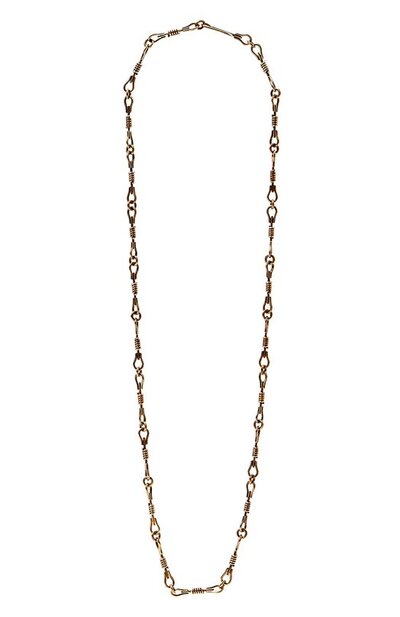 Колье выполнили из серебра 925-й пробы. Винтажный вид аксессуару, напоминающему цепочку из фигурных звеньев со спиральной вставкой, придали гальваническим покрытием оттенка античного золота. Украшение органично поддержит повседневный комплект любой степени сложности.