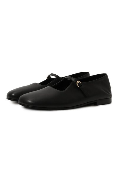 Для создания черных балеток Mary Jane с квадратным мысом и фигурным вырезом использовали особенно мягкую нежную наппу. Тонкая выделка сделала овечью кожу пластичной, поэтому модель комфортно облегает стопу, как носок, подстраиваясь под ее особенности. Узкий регулируемый ремешок застегивается золотистой пряжкой в виде подковы.