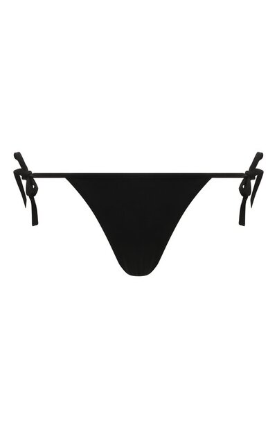 Для пошива черных плавок-бикини использовали мягкую шелковистую микрофибру. Быстросохнущий материал хорошо тянется, поэтому модель с узкими шнурами, завязывающимися по бокам, комфортно садится по фигуре. Сзади — розовая аппликация с надписью Bitchy, подчеркнутая прозрачными кристаллами.