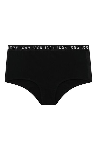 Черные трусы-шорты с широкими боковыми вставками из полупрозрачного эластичного тюля сшили из мягкого джерси. В составе тонкого трикотажа соединили отборный хлопок, шелковистый полиамид и прочный спандекс, поэтому белье не мешает воздуху циркулировать и облегает бедра как вторая кожа. Пояс-резинку украсили контрастным жаккардовым паттерном в виде надписи Icon.