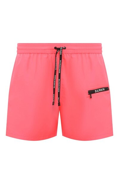 Розовые плавки-шорты с широким эластичным поясом-кулиской сшиты из гладкого быстросохнущего текстиля. Материал хорошо пропускает воздух и почти не ощущается на теле, а прямой комфортный крой не сковывает движения. По бокам — открытые врезные карманы, на бедре — застегивающийся прорезиненной молнией с логотипом бренда.