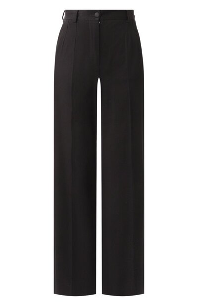 Свободный крой с отутюженными стрелками и правильная длина помогают черным брюкам выстраивать зрительную вертикаль. Для пошива изделия Доменико Дольче и Стефано Габбана выбрали плотный твил из отборного хлопка с небольшим добавлением эластана. Задние врезные карманы дополнены атласными пуговицами, а боковые остались без акцентов. Модель с высокой посадкой представлена эксклюзивно в ЦУМе.