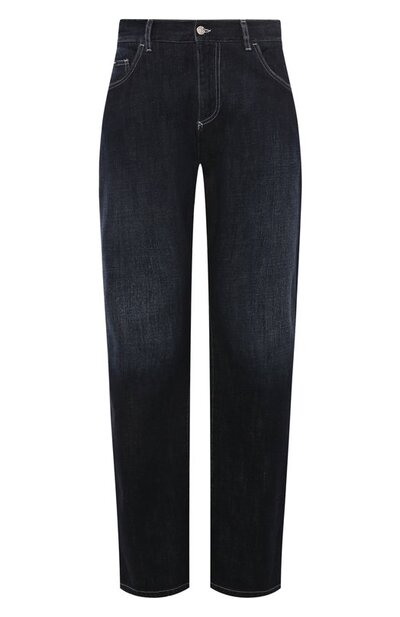 Слегка зауженные лаконичные джинсы темно-синего оттенка поддержат и повседневные, и нестрогие офисные образы. Для пошива модели с высокой посадкой использовали плотный дышащий хлопок. Каждую деталь брюк подчеркнули графичной белой строчкой, а принадлежность бренду обозначили фирменным двухслойным патчем на заднем кармане.