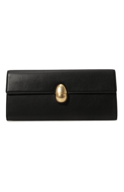 Единственным декором черного прямоугольного клатча, напоминающего конверт, стала сферическая магнитная застежка оттенка античного золота на откидном клапане. Для изготовления аксессуара использовали плотную мягкую кожу с мелким зернением и деликатным блеском. Внутри хватит места для смартфона, ключей, губной помады и картхолдера.