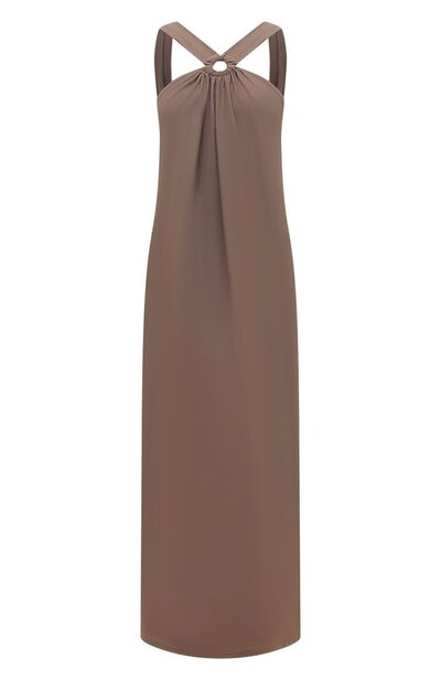 Коричневое платье от Натальи Якимчик будет уместно и в летнем городе, и на морском побережье — стоит лишь сменить аксессуары и обувь. Модель с боковыми карманами выполнили из мелкофактурного эластичного нейлона. Он отлично ложится в складки, поэтому драпировка вдоль кольца на фигурном лифе получилась мягкой.