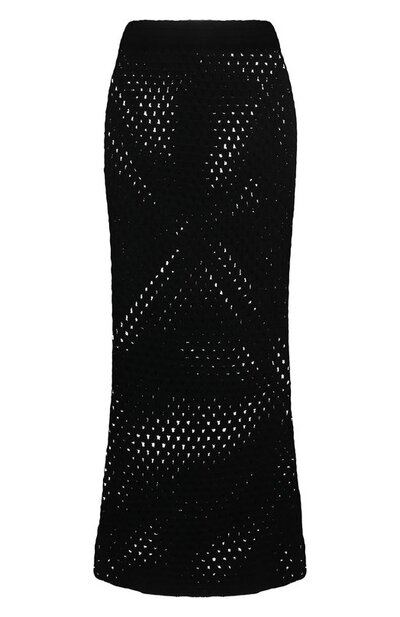 Черную юбку выполнили крупной ажурной вязкой, которая делает изделие полупрозрачным. Уплотнили лишь широкий пояс, отвечающий за удобную посадку на талии. Для создания модели использовали мягкую хлопковую пряжу, укрепленную полиэстером. Наши стилисты предлагают составить образ с парным поло и босоножками в тон.