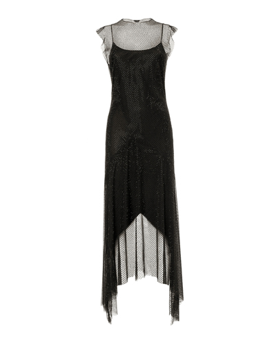 Платье PHILOSOPHY DI LORENZO SERAFINI сшито из сетчатого материала с отделкой кристаллами. Модель облегающего струящегося силуэта с асимметричной линией низа. Застежка на спине на молнию.