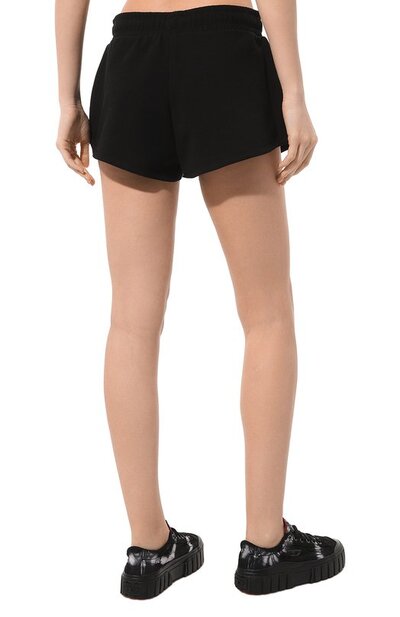 Небольшой принт Moschino swim слева под эластичным поясом-кулиской подчеркивает принадлежность свободных шортов к одноименной линии. На надписи сформировали градиент, поэтому она кажется переливающейся, а металлический блеск усиливает впечатление. Яркость декора оттенили черным трикотажем из мягкого дышащего хлопка.