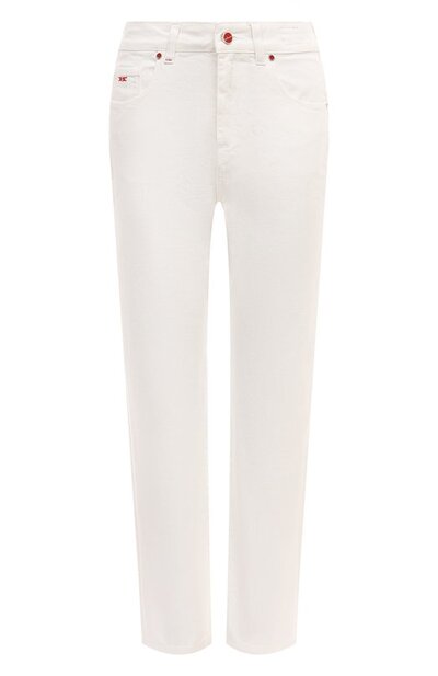 Белоснежные прямые джинсы с высокой посадкой визуально удлиняют ноги. Модель сшили из мягкого эластичного денима, который не препятствует циркуляции воздуха и легко подстраивается под особенности фигуры, сохраняя свободу движений. На принадлежность марке указывают вышитые красные буквы К на монетном кармане и на поясе сзади.
