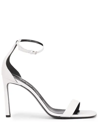 -Белые босоножки из натуральной кожи от SERGIO ROSSI. -Модель с квадратным мысом, узким ремешком-союзкой, закрытой пяткой, ремешками с пряжками вокруг щиколоток, высоким устойчивым каблуком.