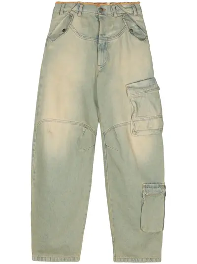 blue cotton washed denim raw-cut edge frayed detailing logo patch to the rear mid-rise belt loops concealed fly and button fastening two side flap pockets multiple cargo pockets wide leg