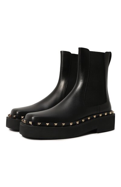 Черные однотонные челси M-Way с квадратным мысом и широкими эластичными вставками сшиты вручную из гладкой телячьей кожи с деликатным блеском. Узкий рант массивной литой подошвы украшен металлическими шипами-пирамидами, которые по праву считаются визитной карточкой бренда, основанного Валентино Гаравани.