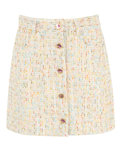 Юбка мини MSGM из бежевого букле с цветными нитями. Модель полуприлегающего силуэта с застежкой на пуговицы и высокой посадкой на талии.
