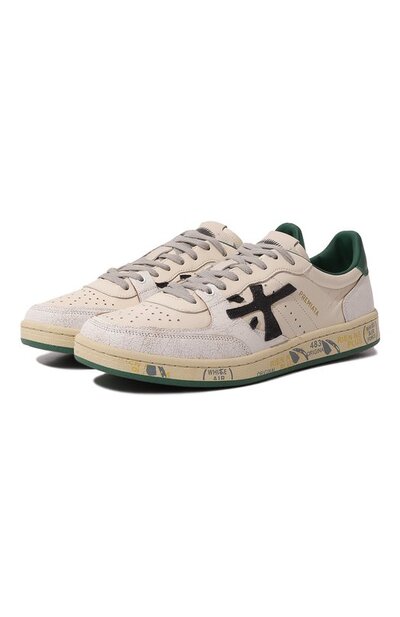 Широкие белые накладки с эффектом кракле придают винтажный вид кремовым кедам Bsktclay и оттеняют гладкость нежной ягнячьей кожи. Контрастные акценты создают черный бархатистый иероглиф сбоку и зеленый задник с серебристым названием модели, разделенным между правым и левым изделиями. Серая шнуровка почти скрывает слоган Be who you are на язычке, а подошву украшает принт в виде печатей и штампов. Внутри – гладкая козья кожа.