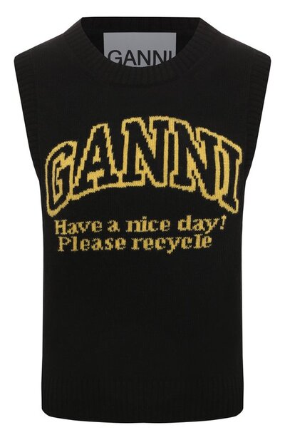 Крупный желтый логотип марки на черном вязаном жилете дополнили надписями Have a nice day! и Please recycle. Идею ответственного отношения к экологии воплощает не только слоган, но и плотный мягкий трикотаж, в котором первичная шерсть переплетена со вторичной. Чтобы модель с ребристыми проймами, горловиной и поясом надолго сохранила первоначальный вид, пряжу усилили переработанным полиамидом.