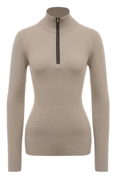 Облегающий бежевый пуловер с высокой горловиной почти не ощущается на теле, но при этом отлично держит тепло благодаря ультрамягкой тонкой пряже из нежного кашемира, прочного шелка и золотистого люрекса. Мастера марки, основанной Брунелло Кучинелли, отделали короткую молнию узким кантом из мерцающих фирменных цепочек мониль.