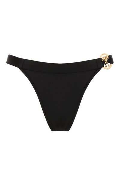 Черные плавки с широким поясом выполнили из тонкого шелковистого материала, в составе которого соединили прочный нейлон и эластан. Изделие тянется, комфортно облегает фигуру и не сползает при сильной волне. Слева модель украсили золотистой ажурной вставкой с узором Double Question Mark, а сзади разместили логотип бренда.