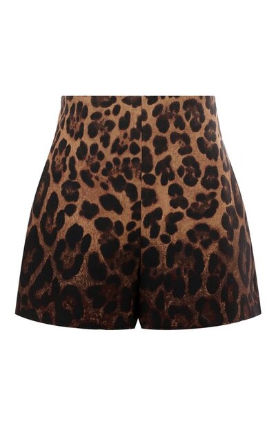 В центр внимания короткие шорты выводит леопардовый принт. Для пошива модели с высокой посадкой и потайной боковой молнией использовали почти невесомую ткань, в составе которой соединили мягкую шерсть первого пострига и гладкий шелк.
