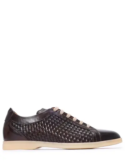-Коричневые кроссовки из натуральной мелкозернистой кожи от BRECOS. -Модель с закругленным мысом, гибкой подошвой, низким каблуком, плетеными боковыми панелями, внутренней отделкой из натуральной кожи.