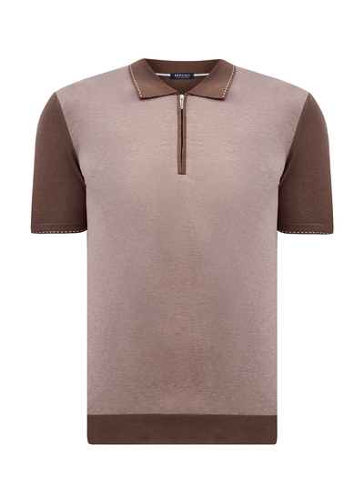 Поло в стиле colorblock от Bertolo сочетает оттенки коричневой гаммы, полностью натуральный состав делает повседневные образы максимально комфортными. Стильный акцент — пунктирный принт по краям. Детали: отложной воротник, застежка-молния с фирменным пуллером, короткие рукава, эластичная окантовка для посадки по фигуре. Сделано в Италии.