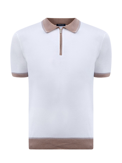 Лаконичный джемпер-поло от Bertolo выполнен из тонкой пряжи на основе хлопка и шелка — полностью натуральный состав делает повседневные образы максимально комфортными. Контрастная отделка кромок и окантовка в полоску вносит неформальный штрих. Детали: отложной воротник, застежка-молния с фирменным пуллером, короткие рукава. Сделано в Италии.