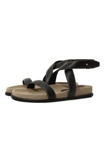 Черные сандалии в исполнении команды марки – удачный вариант для прогулок. Модель с узкой перемычкой и ремешками, которые перекрещиваются на подъеме и застегиваются на щиколотке, выполнили из матовой зернистой кожи, устойчивой к появлению царапин. За комфорт при ходьбе отвечает нескользящая подошва с формованной анатомической стелькой, обтянутой фактурным текстилем.