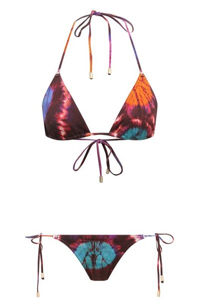 Раздельный купальник с ярким разноцветным принтом тай-дай сшили из мягкой гладкой лайкры, которая быстро высыхает после намокания и не тускнеет под прямыми солнечными лучами. Посадка плавок с глубокими вырезами и бра с плотными треугольными чашечками регулируется завязками.