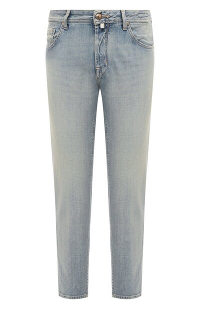 Зауженные голубые джинсы с классической посадкой сшиты из гладкого выбеленного хлопка с потертостями. О принадлежности марке говорит белый жакрон сзади на поясе. Модель, пропитанная фирменным ароматом, дополнена платком, предназначенным для полировки фурнитуры. Предлагаем создать образ с футболкой и кедами белого цвета и зеленым бомбером.