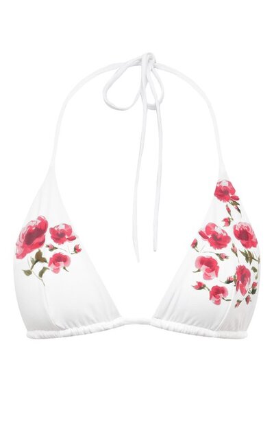 Белое бра с ярким цветочным принтом на мягких треугольных чашечках выполнили из эластичного шелковистого материала, который быстро сохнет, не вытягивается при намокании и не изменяет цвет под воздействием морской воды. Посадку изделия регулируют две пары узких длинных лент, завязывающихся сзади.