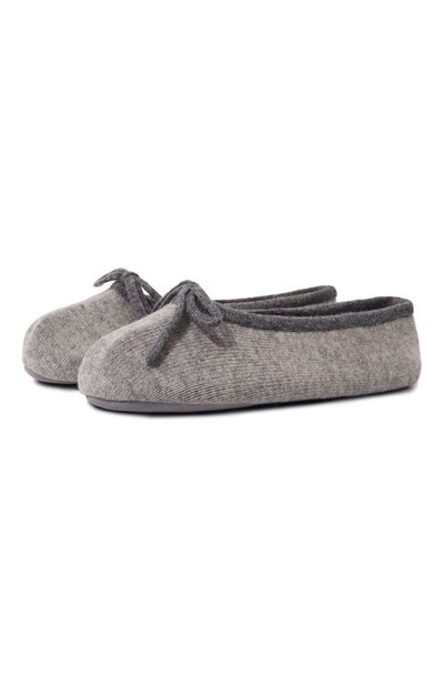 Светло-серые домашние туфли с бантом из шнура на союзке напоминают балетки. Для изготовления модели использовали нежный эластичный трикотаж, который адаптируется к форме стопы и поддерживает оптимальный микроклимат, согревая ноги, но не давая им вспотеть. За комфорт при ходьбе отвечает нескользящая гибкая подошва из бархатистой замши.