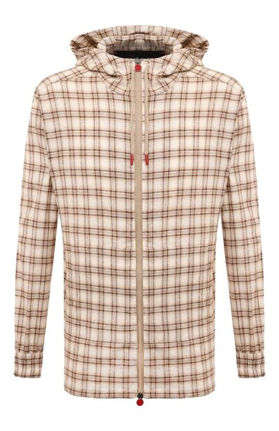 Бежевая толстовка напоминает летнюю рубашку не только полуприталенным кроем и крупной клеткой, но и легким умягченным льном. Прочный полиэстер помогает фактурной ткани меньше мяться, а стрейчевые нити гарантируют, что изделие не будет стеснять движения. Материал раскроили так, чтобы рисунок не прерывался на кармане «кенгуру», плечевых и боковых швах. Модель с эластичными манжетами застегивается встречной молнией с брендированными алыми пуллерами.